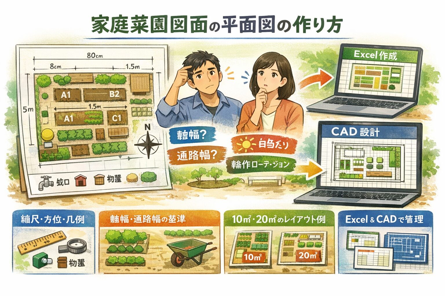 家庭菜園の図面 平面図の作り方|寸法・縮尺・凡例テンプレ集 公開日:2026年2月15日 未分類 <<この記事にはプロモーションが含まれています>> 家庭菜園のレイアウト、頭の中ではできてるのに、いざ図にしようとすると手が止まりませんか。家庭菜園図面の平面図って、縮尺や寸法線、方位、凡例や記号まで入れようとすると意外 […] 続きを読む