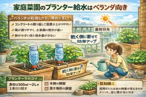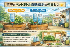 この記事では、ペットボトル給水の方法をタイプ別に整理しつつ、プランターや室内でも使えるやり方、夏の注意点、留守のときにどれくらい持つかの目安まで、初心者でも迷いにくい形でまとめます。