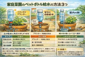 家庭菜園でよく使われるペットボトル給水は、大きく3パターンです。どれも材料が少なく、工作も難しくありませんが、得意なシーンが違います。あなたの栽培環境が「ベランダのプランター」なのか「室内の鉢」なのか、そして「毎日ちょいラク」なのか「留守の自動給水」なのかで、選び方が変わります。