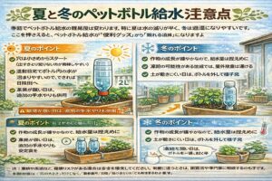季節でペットボトル給水の難易度は変わります。特に夏は水の減りが早く、冬は過湿になりやすいです。ここを押さえると、ペットボトル給水が「便利グッズ」から「頼れる相棒」になりますよ。
