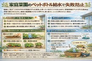 最後に、私が「これだけやれば失敗がグッと減る」と思っているポイントをまとめます。家庭菜園のペットボトル給水は、手軽で低コストなぶん、最初の微調整がかなり大事です。逆に言うと、ここさえ押さえれば、毎日の水やりがほんとにラクになります。