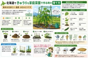 きゅうりは夏野菜の中でも生長が早く、うまくいくと毎日のように収穫できる楽しい野菜です。ただ、北海道は春の寒さや霜、地域ごとの気温差があるので、本州向けの育て方をそのまま真似すると失敗しやすいこともあります。