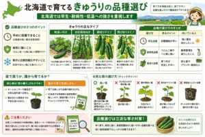 北海道のきゅうり家庭菜園では、品種選びも立派な寒さ対策です。短い栽培期間でしっかり収穫したいなら、早く育ち、病気に強く、家庭菜園向けに扱いやすい品種を選ぶと安心ですよ。