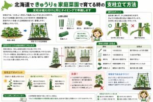 北海道できゅうり家庭菜園の支柱立て方法は、つるを上へ伸ばして風通しをよくするために大切です。きゅうりは地面に這わせることもできますが、家庭菜園では支柱やネットを使った立体栽培のほうが、管理しやすく収穫もしやすいです。