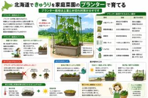 北海道できゅうりの家庭菜園を始めたいけれど、栽培時期や育て方、品種選び、種まき、植え付け時期、支柱、プランター、土づくり、肥料、水やり、病害虫対策、収穫や保存まで考えると、何から準備すればいいか迷いますよね。