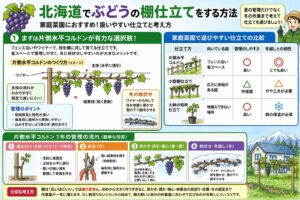 仕立て方の基本をもっと詳しく見たいあなたは、ぶどうの垣根仕立てを家庭菜園で初心者が成功するためのコツもあわせて読むと、枝の流し方がイメージしやすくなります。北海道では、見た目の整い方より、毎年同じ手順で管理できる仕立てが結局強いです。