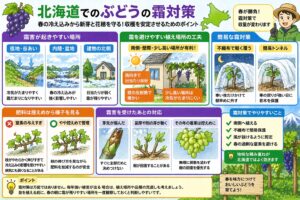 北海道でぶどう家庭菜園をするなら、春の霜対策は外せません。芽が動き始める時期に冷え込むと、新芽や花穂が傷み、その年の収量へ響くことがあります。とくに内陸や盆地、低地は霜だまりになりやすいです。ここを軽く見ると、「苗は元気なのに、毎年春に止まる」という状態になりやすいです。ぶどうの栽培は夏のイメージが強いですが、北海道では春のスタートがかなり重要です。