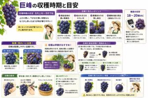 | 巨峰 | 8月上旬〜9月下旬 | 18〜20度前後 | 濃い紫黒色と粒の張り |