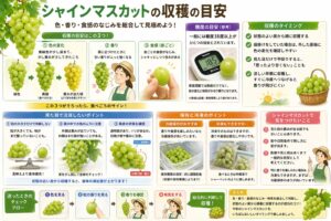 | シャインマスカット | 8月下旬〜10月下旬 | 18〜22度前後 | 黄緑からやや黄み、香り |