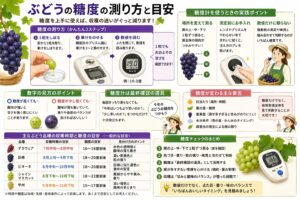 まず、測る粒はできれば房の上・中・下で1粒ずつくらい選ぶと、房全体の傾向が見えやすいです。1粒だけで判断すると、その粒がたまたま甘かった、あるいは日陰で甘さが遅れていた、ということがあります。また、測定前に糖度計のレンズやプリズム部分をきれいにしておくと、見え方のブレを防ぎやすいです。