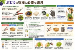 この記事では、家庭菜園ぶどうの収穫時期の考え方を土台にしながら、ぶどう収穫に必要な道具、ぶどう袋掛けに使う道具、ぶどう保存と冷凍の道具、ぶどう病害虫対策の道具まで、家庭で使いやすい目線でやさしく整理します。収穫の見分け方と道具がつながると、毎年の作業がかなりラクになりますよ。読んだあとに、今年の房をどの順番で見ればいいか、何を買い足せばいいかが、すっきり見えてくる構成にしています。