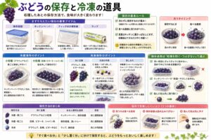 | 冷凍 | デラウェア、巨峰、ピオーネなど | ラップ、保存袋 | 約1か月前後 |