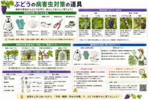 ぶどう病害虫対策の道具としては、噴霧器、手袋、マスク、保護メガネ、剪定ばさみ、誘引用のひもなどが基本になります。病気は薬剤だけで防ぐものではなく、風通しをよくし、雨で葉や房が長く濡れないようにすることでも抑えやすくなります。家庭菜園だと薬剤だけに意識が向きがちですが、実際には樹を整える道具も同じくらい重要です。
