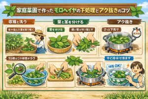 家庭菜園のモロヘイヤは、ポイントを押さえると本当に頼れる野菜です。まず基本は、下処理で葉と茎を分けて、硬い部分を落とすこと。これだけで口当たりが変わって、「モロヘイヤっておいしいかも」になりやすいですよ。