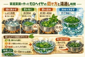 モロヘイヤは、茹で方がシンプルなわりに、時間の差で食感が変わります。ここ、けっこう沼です。私も最初は「何秒が正解なの?」って悩みましたが、結論としては“正解は1つじゃない”です。株の若さ、葉の厚み、茎の固さ、作りたい料理でちょうどいい時間が変わります。なので、まずは基本の型を覚えて、そこからあなたの好みに寄せていくのが一番ラクですよ。