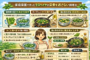 モロヘイヤは、緑黄色野菜らしく栄養がぎゅっと詰まっているのが魅力です。家庭菜園で採れたてだと「なんか元気出そう」って感じ、ありますよね。とはいえ、栄養の話って断定しすぎると危ないので、ここでは“一般的に言われている範囲”で、調理で損をしにくいコツをまとめます。ポイントは「加熱しすぎない」「食べ方を工夫する」の2つです。