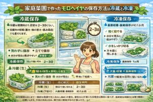 モロヘイヤは鮮度が落ちると、葉がしおれたり、茎が固くなりやすいです。収穫したら、できるだけ早めに使い切るのが基本。とはいえ、一度にたくさん採れたときは保存が必須ですよね。ここでうまく保存できると、家庭菜園が一気に“便利な食材庫”になります。
