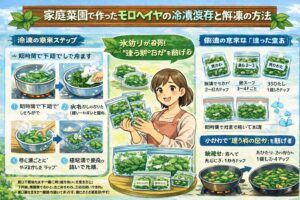 私も最初は、アク抜きの加減や、毒性がある部位(種やさや)をどう見分けるかが気になっていました。この記事では、家庭菜園で収穫したモロヘイヤの食べ方を、下処理・茹で方・生で食べるときの注意点・保存方法(冷蔵と冷凍)・栄養・簡単レシピまで、まとめて整理します。