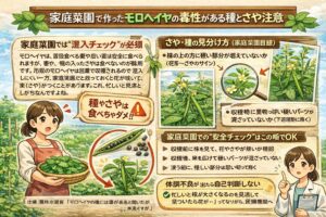 そして家庭菜園でいちばん大事なのが、種やさやを食べないこと。怖がりすぎる必要はないけど、油断もしない。そのちょうどいい距離感で、収穫時期を守って混入チェックを習慣にすると安心です。