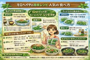 茹でたり煮たりすると、野菜の成分が少しずつ水に出ることがあります。だから、味噌汁や卵スープみたいに“汁ごと食べる”料理にすると、無駄が少ないです。しかもモロヘイヤは粘りがあるので、スープに自然なとろみが出て、喉ごしが良くなるのもいいところ。夏場で食欲が落ちた日でも、スープだと入りやすいですよ。