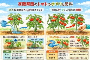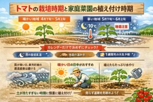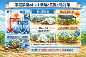 トマトの温度管理は、春は低温回避、夏は高温回避の両方が大事です。家庭菜園では設備が限られるからこそ、植え付け時期を適切に合わせること自体が最大の温度対策になります。