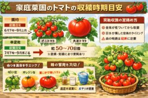 あわせて、支柱、脇芽かき、水やり、追肥、雨対策を丁寧に行うと、家庭菜園でも収穫はかなり安定しやすくなります。最初から完璧を目指すより、あなたの地域の気温と日当たりに合わせて少しずつ感覚をつかむのがおすすめです。とくにトマトは、植え付け時期が合っているだけで管理がかなり楽になります。逆に時期が合っていないと、その後の作業をいくら頑張っても苦戦しやすいです。