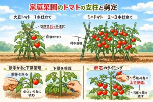 支柱と剪定は、ただ見た目を整えるための作業ではありません。日当たり、通気、病気予防、収穫のしやすさ、果実の品質まで、いろいろな部分に関わります。毎週少しずつ手を入れて整えていくイメージで進めると、夏の管理がぐっと楽になりますよ。
