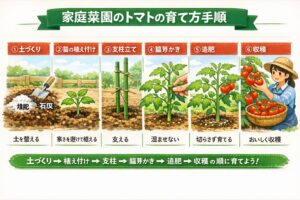 ここからは、実際に家庭菜園でトマトを育てるときの管理面を見ていきます。時期の考え方がわかったら、次は育て方の流れを押さえて、失敗しやすいポイントを先回りでつぶしていきましょう。