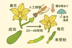 受粉効率は温度条件に左右されます。高温や低温の極端な条件では花粉の発芽や花粉管伸長が鈍り、結果として肥大不良が増えます(出典:青森県「ズッキーニ栽培マニュアル」https://www.pref.aomori.lg.jp/soshiki/nourin/ni-nosui/files/zukkinisaibaimanyuaru.pdf)。