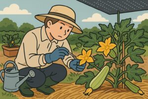 最初のつまずきになりやすいのは、雌雄異花であるがゆえの受粉管理です。ズッキーニは朝に花が開き、数時間でしぼみます。開花当日の早朝から9時頃までが受粉適期で、この時間帯に人工授粉を習慣化すると着果が安定します。雄花を1輪確保し、花弁を外しておしべを露出、雌花の柱頭へやさしく数回タッチするだけで十分です。晴天で乾いた花粉は付着性が高く、雨天や濃霧の朝は成功率が下がるため、前夜に開花直前の蕾へ簡易カバーをかけて花粉を守る方法も有効です(出典:青森県 農林水産部「ズッキーニ栽培マニュアル」https://www.pref.aomori.lg.jp/soshiki/nourin/ni-nosui/files/zukkinisaibaimanyuaru.pdf)。