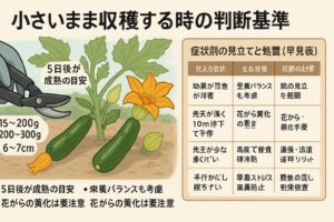 一般的な円筒形品種では、開花から約5日前後で長さ15〜20センチ、重量200〜300グラムが収穫の基準となります。球形品種では直径6〜7センチ程度で若どりします。若どりは食味面の利点があり、繊維が少なく加熱でとろりと仕上がりますが、行きすぎると可食部が薄く歩留まりが落ちるため、株の負担と食味のバランスを見極めることが大切です。