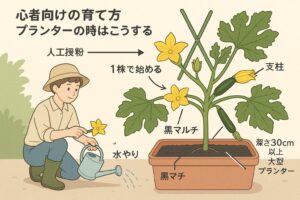 ズッキーニを初めて育てる方は、まず日当たりと風通しの良い場所に1株から始めると管理の基礎がつかみやすくなります。理想は複数株を植えて受粉を安定させることですが、プランター栽培の場合は人工授粉を取り入れることで1株でも十分収穫可能です。人工授粉は開花当日の午前中に行い、雄花から雌花へ花粉を移すだけで着果率が大きく向上します。