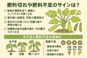 また、葉の黄化が全体に広がる場合は窒素不足、花数の減少が目立つ場合はリン酸不足、果実の肥大不良や先端黒変が目立つ場合はカリ不足の可能性があります。これらの要因を早めに察知し、バランスよく補うことが収量維持の鍵となります。