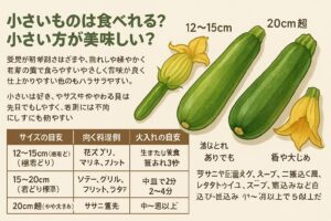 小さい方が美味しいと感じられる背景には、種子の肥大が未成熟であること、細胞壁がまだ薄く水分保持が高いことが挙げられます。油やチーズとの相性がよいのは、果肉の水分と油脂が乳化しやすく、短時間で香りが立つためです。サイズの目安として、円筒形品種は15〜20センチ程度、球形は直径6〜7センチ前後で若どりすると、味と歩留まりのバランスが取りやすくなります。