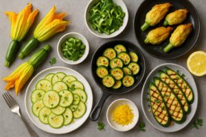 花粉が柱頭にきちんと届き、受粉後に肥大を始めた若い実は、小さいサイズでも食べられます。繊維の発達が進む前なので果肉が均一でやわらかく、火入れ時間を短くしても中心部が心地よい歯ざわりに仕上がりやすいのが特徴です。花が残った状態の花ズッキーニは、花弁が薄く風味が穏やかで、詰め物やフリットなど繊細な料理に向いています。