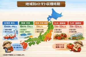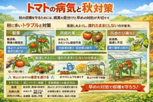 特に、地域ごとのトマト収穫時期の違い、トマト品種の違いと収穫差、露地とプランターはいつまで持つのか、ミニトマトの保存と追熟、トマトの防寒と越冬対策、夏剪定でトマトを秋どりできるのか、トマトの病気と秋対策、収穫後の片付けと来年準備まで、知りたいことが一気に重なりやすいテーマです。
