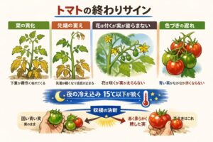 私としては、最終盤の判断は「実の有無」より「株の勢い」と「夜の気温」で見るのがいちばんブレにくいかなと思います。葉が黄化し、花が実にならず、色づきが極端に遅い。この3つがそろってきたら、収穫の終わりが近い合図と考えて大丈夫です。数値はあくまで一般的な目安ですので、最終的な判断はあなたの株の状態を見ながら進めてください。