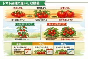 また、収穫時期を地域で比べるときは、ミニトマトか大玉かでも印象が変わります。一般に、ミニトマトは後半も色づきやすく、少しずつ長く採りやすいと感じられることが多いです。一方で大玉は、秋になると完熟まで時間がかかり、裂果や色づきの遅れが目立ちやすい傾向があります。ただし、これは品種や仕立て方によって差が出るため、あくまで一般的な傾向として考えてください。つまり、地域差だけでなく、品種の性格まで含めて見ると「うちのトマトはいつまでいけそうか」が見えやすくなります。