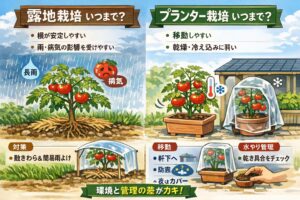 また、収穫を長く楽しめるかどうかは、育て方でも差が出ます。ミニトマトや中玉は比較的長く採りやすく、大玉は終盤に裂果や色づき遅れの影響を受けやすいです。露地は根が安定しやすい一方で、雨や霜の影響を受けやすいです。プランターは温度変化と水分管理が難しい反面、置き場所を動かして守りやすい強みがあります。つまり、どの栽培法が絶対に有利というより、特徴に合わせて調整できるかが大きいです。
