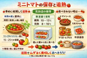 ミニトマトの保存と追熟を知っておくと、家庭菜園のトマトをいつまで楽しめるかが一段変わります。収穫の終盤は、木の上で完熟するのを待つことだけが正解ではありません。むしろ、気温が下がってきた時期は、少し早めに収穫して室内で仕上げたほうが、裂果や鳥害、病気を避けやすいことがあります。ここ、意外と大事です。