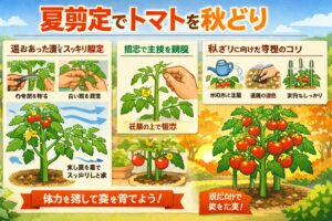 夏剪定でトマトを秋どりする方法は、家庭菜園で収穫期間を延ばしたい人にとってかなり有効です。真夏のトマトは勢いが強く、気づくと枝葉が込み合って、株の中に光が入らなくなりますよね。そのまま秋に入ると、風通しの悪さから病気が出やすくなり、葉が蒸れて弱り、実の太りや色づきも落ちやすくなります。そこで、夏のうちに余分なわき芽や古い葉を整理して、秋に向けた体力配分を整えていきます。