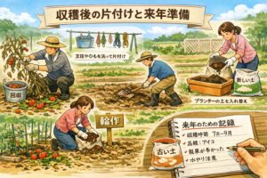 そして、収穫が終わったら片付けまで丁寧に行うことが、来年の成功につながります。病気っぽい株や落果を残さず、資材を整え、土の扱いを見直しておくと、次のシーズンがぐっと始めやすくなります。家庭菜園は毎年同じようでいて、天候も品種の反応も少しずつ違います。だからこそ、「今年の終わり方」を観察することが、来年のいちばんよい準備になります。
