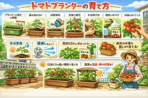 最後に、私がプランター栽培でとくに大事だと感じているコツをまとめます。ひとつ目は、土量をケチらないこと。ふたつ目は、水分を急変させないこと。みっつ目は、追肥を少量で継続すること。そして四つ目は、風通しを保つことです。実際、トマト栽培の失敗は、この4つのどれかが崩れたときに起きやすいです。逆に言えば、特別な裏技がなくても、この土台を丁寧に守るだけで収穫はかなり安定します。