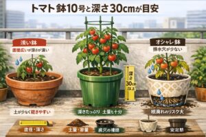 よくある失敗は、直径だけ見て選んでしまい、深さが浅い容器を買ってしまうことです。浅鉢だと土量を確保しにくく、表面だけ乾いて見えても中が蒸れていたり、逆に真夏の乾燥が急激になったりします。私としては、直径と深さの両方を見るのがコツかなと思います。さらに、支柱を立てる予定があるなら、鉢の縁がしっかりしていて、揺れにくい形かどうかも見ておくといいです。背丈が高くなるトマトは、株が育つほど上部に重心が寄るので、容器の安定感があとから効いてきます。