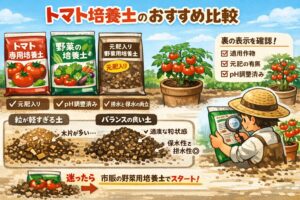 土選びで迷ったら、最初は野菜用培養土がいちばん無難です。pHや元肥があらかじめ調整されている商品が多く、初心者でも再現しやすいからです。自分で配合する方法もありますが、失敗を減らしたいならまず市販の培養土から始めるのがラクですよ。とくにトマト栽培は、水持ちがよすぎても悪すぎても困るので、最初からある程度バランスが取れた用土を使うメリットは大きいです。
