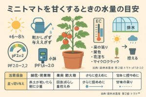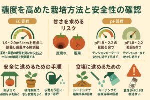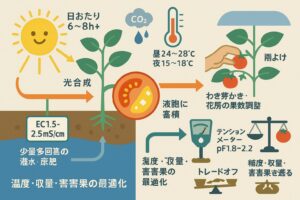 これらの管理は「糖度だけ」を追うのではなく、「糖度・収量・障害果抑制」を同時に最適化する視点が肝心です。培地水分をテンションメーター等で客観的に把握し、乾かし過ぎ・与え過ぎの両方を避ける穏やかな制御にすると、品質の再現性が高まります。