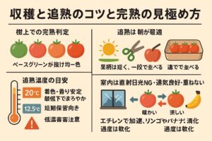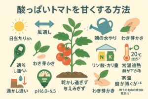 追熟については、収穫後の温度条件により酸(とくにクエン酸)が減少し、甘く感じやすくなるという知見がありますが、糖そのものの増加は限定的とする資料もあります。したがって、畑・鉢の段階で日照と水分の設計を整えることが、味づくりの中心的な対策になります。