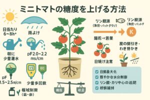 ミニトマトはもともと果実が小さく、濃縮効果を得やすいため、大玉より高糖度に到達しやすい特性があります。雨よけや根域制限(袋・鉢栽培)を取り入れると、余分な水の進入を抑えやすく、安定的に味を乗せる条件を整えられます。