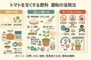 甘さの向上は肥料単体の効果ではなく、日照・水分・樹勢・着果数の総合設計で決まります。酒粕はあくまで補助的な位置づけとし、根が健全に呼吸できる環境と穏やかな水分制御を優先することで、風味の向上と栽培安定性の両立が実現しやすくなります。