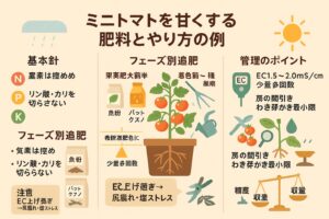 養分面では、元肥の窒素を抑えめにし、開花〜着果期はリン酸源(魚粉・バットグアノ等の有機系や過リン酸石灰など)を補強、果実肥大〜着色期はカリを切らさない設計にすると、実どまりと風味の厚みを両立しやすくなります。鉢や高EC施肥は甘さを押し上げますが、やり過ぎると草勢低下、尻腐れ、裂果が増えるため、ECや葉色・葉の張りを見ながら少量多回数で微調整するのが安全策です。